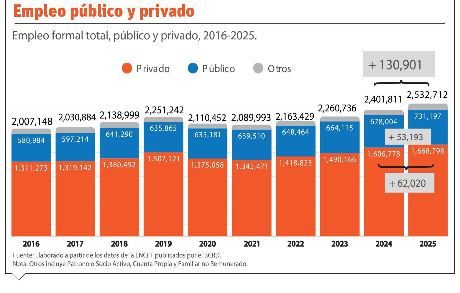 Según un informe de la Dirección de Inteligencia de Datos del Ministerio de la Presidencia, el 65.9% de los empleos formales en 2025 provienen del sector privado, lo que equivale a 1,668,798 puestos. Por otro lado, el sector público representa el 28.9%, con un total de 731,197 empleos. En comparación con el año anterior, el país generó 133,915 nuevos puestos de trabajo, manteniendo una tasa de desempleo del 5.0%.